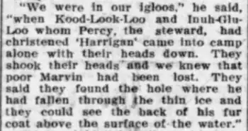 Marvin was originally believed to have drowned, as Kudlookto reported that Marvin's body was discovered after he fell through thin ice.[2] Peary subsequently sent a telegram to Elmira reporting, "Drowned April 10, 1909 45 mile north of Cape Columbia while returning from 86 degrees 38 minutes North Latitude."[1][11] However, Kudlookto stated in 1926 that he had shot and killed Marvin, either because Marvin had started acting irrationally,[1] or because Marvin refused to let Kudlookto's cousin rest[2]—sources differ. In 1954, Peary’s daughter stated that she believed Marvin drowned, and discounted Kudlookto's story.[1]