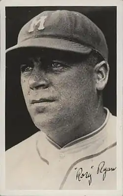 Ryan went 15–8 with a 1.36 earned run average (ERA) for the Buffalo Bisons of the International League in 1919, and was called up by the New York Giants late in that season. He made his major league debut on September 7, getting the start on the mound in the second game of a doubleheader against the Boston Braves at the Polo Grounds. The game featured a pair of Baseball Hall of Famers at shortstop in Boston's Rabbit Maranville and the Giants' Frankie Frisch. Ryan twirled five innings, allowing eight hits and three earned runs, taking the loss in the Giants' 4–2 defeat.[3] Ryan appeared in four games for the Giants that season, then had another impressive season in the International League in 1920 with the Toronto Maple Leafs, and appeared in three games for the 1920 Giants.