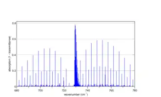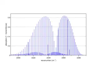 - ^ Observed spectra of the fundamental band (shown here) and the first overtone band (for double excitation near 2 × 2140 cm−1) can be seen in Banwell and McCash, p 67