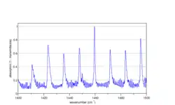 Ro-vibrational spectroscopy concerns molecules in the gas phase. There are sequences of quantized rotational levels associated with both the ground and excited vibrational states. The spectra are often resolved into lines due to transitions from one rotational level in the ground vibrational state to one rotational level in the vibrationally excited state. The lines corresponding to a given vibrational transition form a band.[1]
