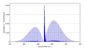 - ^ Traditionally, infrared spectra are shown with the wavenumber scale decreasing from left to right, corresponding to increasing wavelength. More modern texts may show the wavenumber scale increasing from left to right. The P-branch is always at lower wavenumbers than the Q-branch.