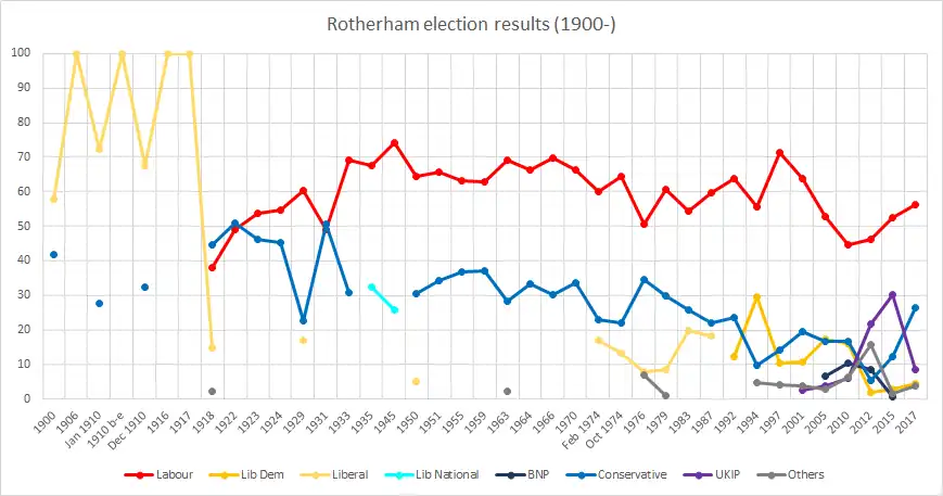 Rotherham has consistently returned Labour MPs since a by-election in 1933, following the earlier period before 1923 dominated by the Liberal and Conservative parties. The numerical Labour majority in every general election from 1935 onwards has been in five figures, with the exceptions of 2015, 2019 and 2024.