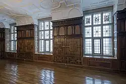 The paneling of the Rotherwas Room is made of walnut, a highly valued imported wood most likely imported from Germany or the Netherlands.[36] While oak was widely used in construction in the Rotherwas estate due to its abundance on the five thousand acre property, large walnut trees did not exist in England prior to 1650 and were rarely used in English paneling if at all.[8] The wainscoting design of lower inner-framed tiers and upper-arcaded panels divided by pilasters and capitals is extremely similar to that of Billesley Manor, Warwickshire and Carbrook Hall, near Sheffield.[37] According to Charles Bodenham, the two doors cut out of the paneling were added in 1611 and 1732 respectively.[38]