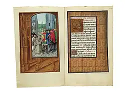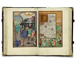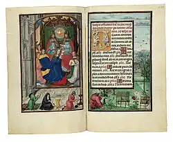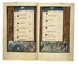 There are wide borders, many with flowers and other objects and drolleries, and another group with trompe-l'œil imitations of bronzes. Other borders frame the miniature with illusionistically painted wooden tracery.[8] Some pages follow the fashion of showing one scene as a framed inset within another larger one,[9] In total 140 pages, over half of the whole book, have significant decoration outside the text. The calendar has scenes of the Labours of the Months at the bottom of the pages.[10] As with other very lavishly illuminated manuscripts, it was probably worked on over a long period.