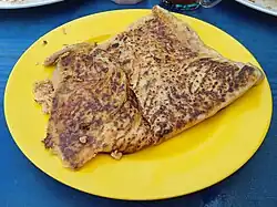 ![]() Roti telur, a type of roti canai with egg filling, served on a banana leaf | |