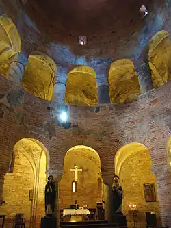 It was built during the reign of the Canossa family in the late 11th century. Inspired by the Holy Sepulchre church in Jerusalem and dedicated to the martyr St. Lawrence, it has a central plan and has maintained ancient features like the matronaeum (loggia for female faithful) and frescoes of the Byzantine school from the 11th-12th century. Another fresco fragment in the apse, portraying the Martyrdom of St. Lawrence, dates to the 15th century. The construction, according to the Lombard tradition, is in bricks, but has two columns and other details in marble, coming from ancient edifices.