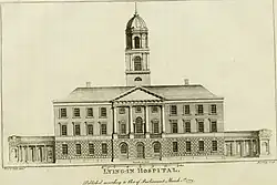 The hospital was founded by Bartholomew Mosse, a surgeon and midwife who was appalled at the conditions that pregnant women had to endure, in George's Lane in March 1745.[4] It was granted by royal charter on 2 December 1756 by King George II.[5] Lying-in is an archaic term for childbirth (referring to the month-long bed rest prescribed for postpartum confinement).[6] The venture was very successful and Mosse raised money through concerts, exhibitions and even a lottery to establish larger premises.[7]