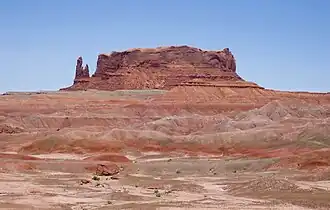 Round Rock is located 4.5 miles (7.2 km) west of the community of Round Rock on Navajo Nation land, and can be seen from Highway 191. Round Rock is a mesa composed of cliff-forming Triassic Wingate Sandstone overlaying slope-forming Chinle Formation.[4][5] Little Round Rock is a 6,113-foot-elevation (1,863-meter) butte less than two miles to the north.[6] Precipitation runoff from this irregularly-shaped mesa's slopes drains into Agua Sal Wash and Chinle Wash which are part of the San Juan River drainage basin.[2] Topographic relief is significant as the summit rises 700 feet (213 meters) above the surrounding terrain of Chinle Valley in one-quarter mile (0.4 km). The nearest higher neighbor is Los Gigantes Buttes, 10.5 miles (16.9 km) to the northeast.[1][2] The landform's toponym was officially adopted on April 7, 1915, by the U.S. Board on Geographic Names.[3] The Navajo call the mesa Tsé Nikání which means round flat-topped rock.[3][7] According to legend, the Navajo used Round Rock as a fortress to escape from foes, by climbing it with braided ropes made out of yucca, then hauled the ropes up to leave their enemies behind.[8] However, a different story claims that Navajos do not climb the sacred rock out of fear of punishment from lightning, snakes, bears, or whirlwinds.[9]