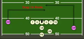 A drag route (also known as an in route or a dig route) is a route run by a receiver, where the receiver runs a few yards downfield, then turns 90° towards the center of the field and runs parallel to the line of scrimmage.[5][6] This type of route is relatively safe and is thrown to an agile receiver who can make a play after the catch. Alternatively, a drag route may be used as a second option if the principal receiver on a play is covered.