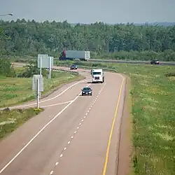 When the route of the Trans-Canada Highway was defined in about 1950, it did not follow Route 2 via Saint John between Fredericton and Sussex, but took the more direct Route 9.[10] Through the late 1950s and 1960s, a number of bypasses and realignments, mostly two-lane, were built to improve Route 2 with federal Trans-Canada Highway funds. The first, built in the 1950s, was around Moncton, between southwest of Salisbury and Sackville. The old road through Moncton became Route 2A, then Route 6 in 1965, and is now Route 106.[11]