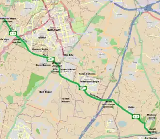 Route 411 (Hebrew: כביש 411), is the designation of a regional route in the Shephelah region in Israel running southeasterly consolidating previous local roads and new construction. The western section begins at Highway 42 near Kfar Gevirol in western Rehovot and continues just past Route 410. The central section, completed in June 2014, continues to the entrance of Kvutzat Shiller. The eastern section begins just short of Highway 40 south of Rehovot and terminates at Highway 3 towards Jerusalem, bypassing the towns of Kiryat Ekron and Mazkeret Batya.