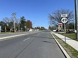 Past this intersection, Route 49 enters a more suburban landscape, crossing CR 621 (W. Park Drive).[1][2] The route enters Bridgeton and becomes West Broad Street. In Bridgeton, it intersects CR 607 (West Avenue), CR 650 (Fayette Street), and CR 697 (Atlantic Street). Route 49 crosses the Cohansey River and comes to an intersection with Pearl Street, which heads to the north as Route 77 and to the south as CR 609. Past Pearl Street, Route 49 intersects CR 670 (East Commerce Street/Buckshutem Road) and crosses a Winchester and Western Railroad line as it continues to the east on East Commerce Street. It crosses CR 638 (N. Burlington Road) and enters Fairfield Township.[1]
