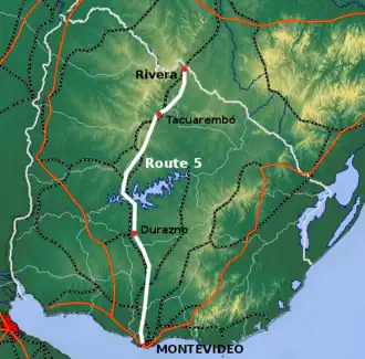 Route 5 is a national route of Uruguay. In 1975, it was assigned the name Brigadier General Fructuoso Rivera, a national hero of Uruguay.[1] It is one of the most important highways in country, along with Route 3, connecting Montevideo in the south with Rivera in the north and passing through the centre of the country. The road is approximately 501 kilometres (311 mi) in length.[2][3] Upon reaching Santana do Livramento (the Brazilian extension of Rivera), the road joins federal highway BR-158.
