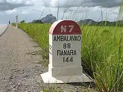 Route nationale 7 (RN7) is a primary highway in Madagascar running 980km[1] from the capital Antananarivo to Tulear at the south-west coast of the country. It crosses the regions of Analamanga, Vakinankaratra, Amoron'i Mania, Haute Matsiatra, Ihorombe, and Atsimo-Andrefana.