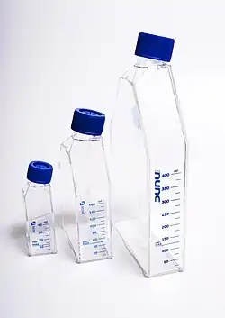 A Roux culture bottle, or simply Roux bottle, is a type of laboratory glassware used in biology and related sciences to grow microorganisms or tissue cells.[1]: 5 [2]: 1886 It consists of a bottle of transparent glass[3] or plastic[4] with two closely spaced flat, rectangular, parallel faces and a short neck; of such a design that the bottle can be laid down sideways, on one of those two faces, even when unstoppered and partially filled with a culture medium. This goal is achieved by having the neck narrowed,[3] offset,[5] partially blocked,[6][7] or canted (tilted).[8][9] The item is also generically called cell culture bottle[4] or tissue culture (TC) bottle,[8] and flask may be used instead of "bottle".[3]