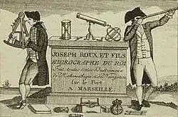 Mathieu-Antoine Roux, who like his father went by “Antoine Roux”, was born in Marseille, France on May 20, 1799, to the elder Antoine and Rose Elizabeth Gabrielle Catelin. He would be the first of four children to the couple. Antoine also became a painter, although he is not considered to be quite as skilled as his brothers or father were. He ended up taking over the hydrographic business of an uncle only a short distance from the one his father ran.[13][14] He used the same image his grandfather had introduced in his hydrographic shop and that became associated with the Roux family, that of the two little men, one using a telescope and the other using an octant.[15] Upon Antoine's death on January 26, 1872, his son François Antoine Roux, nicknamed “Tonin”, took over the hydrographic shop.[16] To distinguish his paintings from those of his father, Antoine's signatures were very clear. He often signed “Ante Roux fils ainé”, which can be translated as “Antoine Roux eldest son”.[17][18]