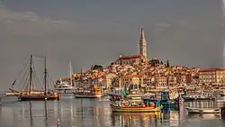 Rovinj (Croatian: [rǒviːɲ]; Venetian and Italian: Rovigno;[5] Istriot: Ruvèigno or Ruveîgno; Ancient Greek: Ρυγίνιον, romanized: Rygínion; Latin: Ruginium) is a city in west Croatia situated on the north Adriatic Sea with a population of 14,294 (2011). Located on the western coast of the Istrian peninsula, it is a popular tourist resort and beach destination, in addition to being an active fishing port. Istriot, a Romance language once widely spoken in this part of Istria, is still spoken by some of the residents. The town is officially bilingual, Croatian and Italian, hence both town names are official and equal.[6]