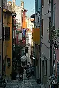 From 1283 to 1797, Rovinj was one of the most important towns in Istria governed by the Republic of Venice.[10] During this period, three town gates were constructed and Rovinj was fortified by two rows of defensive walls, remains of which can still be seen today.[11] The Rovinj pier is home to one of the old town gates, Balbi's Arch, dating from 1680, and a late-Renaissance clock tower.[12] The first city statute was proclaimed in 1531.[13]