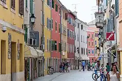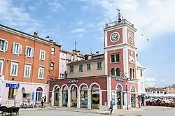From 1283 to 1797, Rovinj was one of the most important towns in Istria governed by the Republic of Venice.[10] During this period, three town gates were constructed and Rovinj was fortified by two rows of defensive walls, remains of which can still be seen today.[11] The Rovinj pier is home to one of the old town gates, Balbi's Arch, dating from 1680, and a late-Renaissance clock tower.[12] The first city statute was proclaimed in 1531.[13]