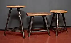 In a document celebrating the 50th anniversary of the company, the Rowac stool is touted as the first steel stool to be manufactured and sold.[2] The first model, a three-legged stool with a round wooden seat, was conceived in 1905 and presented for the first time at the Leipziger Michaelis-Messe (Leipzig Michaelis Trade Fair) in 1909.[23] Rowac advertised the stool in a brochure as follows: "One principle applies to every business: work that can be done just as well sitting down should never be done standing up".[15] At first it was a big gamble to bring this entirely new product to market.[2] But as early as 1909, it was praised in the General Journal for Watchmaking (Allgemeinen Journal der Uhrmacherkunst) for its great durability compared to simple wooden stools for use in workshops. In addition, the purchasing costs were also much lower because repairs were virtually eliminated. Among others, the Rowac stools were brought to market by the retailers Gustav Sturm in Leipzig and Wilhelm Herbst in Berlin.[10][24] By the 1920s at the latest, they were in widespread use, especially in workshops and factories. Today, the three-legged stool is one of Rowac's best-known products. It was not only offered in different heights, but also with a backrest (model IV), as a four-legged version with a rectangular wooden seat (model II), as a folding stool and for special applications also as a height-adjustable swivel stool (model III). A rare example is model Ib, which is welded rather than riveted like all the other models.