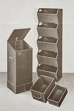 Industrial enterprises of the time made extensive use of containers for storing and transporting small parts and components. Wooden containers were known to fall apart after heavy use, leading Rowac to introduce a sturdy metal alternative. Metal and wooden products were often cleaned and polished using cotton wool soaked in flammable oils. To prevent fires, the company developed fireproof bins for storing this used up cotton wool. Rowac not only offered a wide range of containers, but also created customised solutions based on customer needs and requirements. The transport containers, for example, were available in different sizes, in a tapered format, with a handle opening and optionally with or without compartments. On request, not only different materials (plain or galvanised steel) but also different material thicknesses and even the option of oil-tight welding could be specified. All transport containers were provided with a strong round steel reinforcement along the upper edge for a particularly long service life. Like the transport containers, the open front storage boxes were also offered in different sizes according to requirements and were equipped with handle openings and two bottom rails made of hardwood. The cotton wool bins had a carrying handle on each side and an embossed label. They were available in three different variations, and could be commissioned either with an automatic closing lid, or if desired, with a foot lever to open the lid automatically. The galvanised waste bins were particularly sturdy, had a swing-open lid with strong hinges, firm handles on both the lid and sides, and could also be fitted with an additional hanging hook.[15]