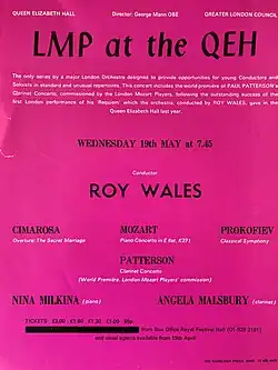 The London Mozart Players commissioned Patterson's Clarinet Concerto[33] and Wales conducted the World Premiere on 19 May 1976 in the Queen Elizabeth Hall with the LMP and Angela Malsbury, clarinet.[34][35]