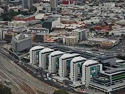 The new Royal Adelaide Hospital is located on a 10 hectares (25 acres) former railyards site within the Adelaide Park Lands. It is situated on the north side of North Terrace and west of Morphett Street.[16] Starting construction in 2011, costing over A$2 billion, the new Royal Adelaide Hospital is the most expensive hospital built in Australia,[17] taking 1st place from the $2 billion Fiona Stanley Hospital in Perth. The contractor was a joint venture of Hansen Yuncken and Leighton Contractors.[18] The building was completed in 2017, and the move from the old hospital into the new site was completed over four days, 4–7 September.[19]
