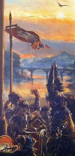 With Poland's conversion to Christianity in the late 10th century, the pagan stanice were probably Christianized by replacing pagan symbols with Christian ones such as images of patron saints, or a Chi-Rho or dove symbolizing the Holy Spirit.[2] In the year 1000, during his pilgrimage to the tomb of Saint Adalbert in Gniezno, the capital of Poland until about 1040, Emperor Otto III officially recognized Duke Boleslaus the Brave as King of Poland (see Congress of Gniezno), crowning him and presenting him with a replica of the Holy Lance, also known as Saint Maurice's Spear. This relic, together with the vexillum attached to it, was probably the first insignia of the nascent Kingdom of Poland, a symbol of King Boleslaus's rule, and of his allegiance to the Emperor. It remains unknown what images, if any, were painted or embroidered on the vexillum.[1][3]