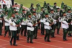 The Royal Brunei Armed Forces Band (RBAF Band) was established on 31 May 1962, at Port Dickson in Malaysia. It originally had twenty-one members, and was then badged as the regimental band of the Brunei Malay Regiment. On 1 January 1984, Major Haji Manaf bin Kamis became the first local musician to be appointed Director of Music. Kamis was the judge at a competition which chose the official anthem of ASEAN. Since 2003, the band has been led by Major Jaya bin Metussin. Along with its official military engagements, it has participated in events such as the Edinburgh Military Tattoo, the Brunei Darussalam International Tattoo, and the Berlin Military Music Festival.[21] The RBAF Band first participated in the Hari Merdeka celebrations and the Kuala Lumpur International Tattoo in Malaysia in 2007, and has since become a regular participant.[22]