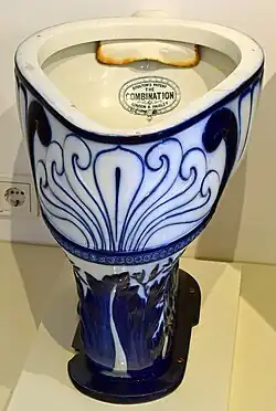 Manufacturing of circular ceramic sewage pipes began in 1846, and was highly successful; Henry Doulton set up his own company specializing in this, Henry Doulton and Co., the first business to make these. This merged with the main business in 1854.[5] His brother John Junior also later set up his own pipe-making business.[6] Previously sewers were just channels made of brick, which began to leak as they aged. The 1846–1860 cholera pandemic, and the tracing by Dr John Snow of the 1854 Broad Street cholera outbreak in London to a water supply contaminated by sewage led to a huge programme of improving sewage disposal, and other forms of drainage using pipes. These and an expanding range of builder's and sanitary wares remained a bedrock of Doulton into the 20th century. Metal plumbing items such as taps and cast iron baths were added to the range later. Kitchen stonewares such as storage jars and mixing bowls, and laboratory and manufacturing ceramics, were other long-standing specialities.[5] Further facilities were set up for making these in Paisley in Scotland, Smethwick, St Helens near Liverpool, and Rowley Regis in England, and eventually Paris.[7]