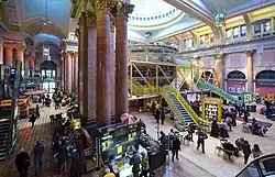 The second exchange was replaced by a third designed by Mills & Murgatroyd, constructed between 1867 and 1874.[5] It was extended and modified by Bradshaw Gass & Hope between 1914 and 1931 to form the largest trading hall in England.[5][6] The trading hall had three domes and was double the size of the current hall.[1] The colonnade parallel to Cross Street marked its centre. On trading days merchants and brokers struck deals which supported the jobs of tens of thousands of textile workers in Manchester and the surrounding towns.[2] Manchester's cotton dealers and manufacturers trading from the Royal Exchange earned the city the name, Cottonopolis.[7]