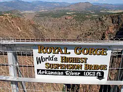 The Royal Gorge Bridge is a tourist attraction in the United States near Cañon City, Colorado within Royal Gorge Bridge and Park, a 360-acre (150 ha) amusement park located along the edge of the Royal Gorge around both ends of the bridge.[9] The bridge crosses the gorge 955 feet (291 m)[note 1] above the Arkansas River[5] and held the record of highest bridge in the world from 1929 until 2001 when it was surpassed by the Liuguanghe Bridge in China.[10] The Royal Gorge Bridge maintained the title of the world's highest suspension bridge until the Beipan River Guanxing Highway Bridge was completed in 2003, also in China.[10] The bridge remains the highest bridge in the United States and was among the ten highest bridges in the world until 2012.[10]