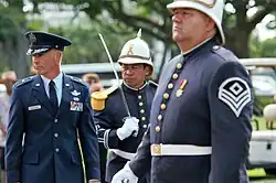 The Royal Guard's historical uniform and helmet represent the Hawaii National Guard at the National Guard Heritage Room at Joint Base Fort Myer-Henderson Hall in Virginia, and are currently the only unit in the U.S. Military authorized to wear a pith helmet.[19][24]