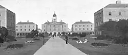 Directly opposite the water gate (with its jetty) was the main entrance from the street, which was flanked by a pair of lodges which provided accommodation for officers of the Royal Marine detachment which provided a guard for the Hospital;[28] the Marines themselves were accommodated in a small barracks just outside the gate, similar in design to the nearby (and near-contemporary) Stonehouse Royal Marine Barracks.[29] Later, police took over guard duty, and the barracks became a police station;[2] in 1911 the main gate was shifted a hundred yards to the south, which brought the barracks within the main perimeter.[1]