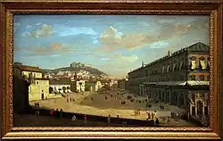 During the course of the work, the eastern wing facing the Castel Nuovo was completely remodelled; the Belvedere wing was demolished; the unfinished south façade facing the sea was completed, uniting it with the existing Fontana-era façade and crowning the central section with a new belvedere of white marble; and the private apartments of Ferdinand II and Maria Theresa of Austria were moved to the second floor, leaving the former first-floor apartments for official receptions only.[25] The surroundings of the palace also underwent major transformations. Between 1841 and 1843 the Viceregal palace was demolished, creating in its place the Piazza San Ferdinando (now Piazza Trieste e Trento), and Friedrich Dehnhardt created a new romantic rear garden by demolishing old stables and other buildings.[9]