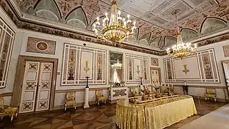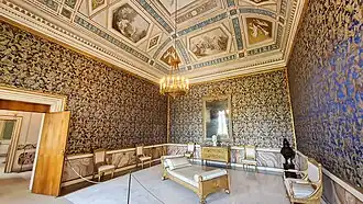 The internal decoration of the spaces, following the exuberance of the Empire style close to Percier and Fontaine, was entrusted to Giuseppe Borsato, assisted by Giovanni Carlo Bevilacqua and Giambattista Canal. These tasks extended from 1810 to 1811 and focused not only on the reception rooms facing the square but also on the private rooms facing the lagoon and the gardens.[5] The former ridotti in the Marciana Library, converted into quarters for Eugène de Beauharnais, were also decorated during this period (1807–1808).[6][7]