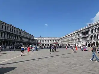 However, Venetian institutions required that the procurators live on the square. Yet, they lacked suitable housing. The Procuratie Vecchie (Old Procuracies), built between 1514 and 1538 on the north side of the square, were not used as residences but were rented out at a good price to support the city's administration.[2] To address this issue, an old pilgrims' hospice on the south side of the square was converted into residences for the procurators, six in total, which were occupied based on seniority in the position. However, procurators often declined to reside in these spaces, citing their poor condition, dampness, and lack of light, preferring to live in their city palaces and rent out the procuracies to third parties.[3]