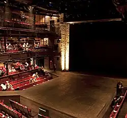 The theatre is a "one-room" theatre, which allows the actors and the audience to share the same space, as they did when Shakespeare's plays were first produced. The stage reaches out into the audience, who are seated on three sides of it. This one-room theatre creates a more traditional Shakespearean performance area, allowing the audience to draw closer to the actors and creating a more personal theatre experience.