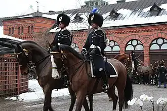 The stables contain around 20 horses, all bay in colour. While their physical appearance is important — the horses must also be around 170 centimetres (5.6 ft) tall and "with an attractive gait" — they also need to have a steady temperament and are trained substantially to be able to cope with working in a busy city environment. They receive two years initial training after they are bought by the stables (at an age of between five and seven years) and are thereafter also trained daily on Djurgården.[4] The stables contain around 50 different carriages, sleighs and coaches. The State Coach, also called the Glass Coach, dates from 1897 and is the most elaborate of these.[2] It is used at the ceremonial opening of the parliament and on formal state visits by other heads of state during bad weather (in fair weather an open carriage is used). The coaches at the stable range in age from the mid-19th century to the early 20th century.[5]
