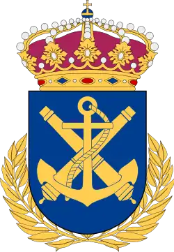 The coat of arms of the Royal Swedish Naval Academy 1867–1987. It was later used by the Swedish Navy Staff College (Marinens krigshögskola, MKHS) from 1987 to 1998 and the Swedish Naval Warfare Centre since 2005. Blazon: "Azure, an anchor erect cabled surmounting two gunbarrels of older pattern, or. The shield surmounted an open chaplet or."[11]