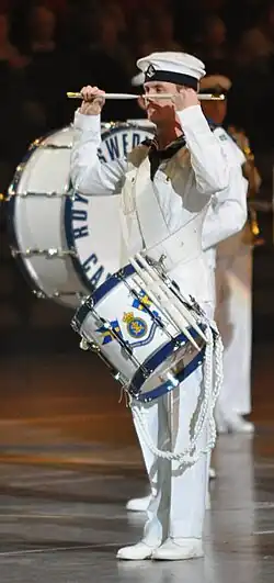 The First drummer, or Drum Major (Swedish: flaggtrumslagare) is the leader of the band during parades and figurative shows. The First drummer's tasks include rehearsal of marching exercise and figurative shows, for performances. The first drummer does not carry a drum; the title is better understood as the leader of the drummers (and as such of the band). The sign of command of the first drummer is the ceremonial mace, and by tradition, an ornate drum strap is carried across the shoulder as well.