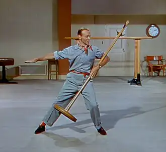 - "Sunday Jumps": Astaire parodies himself by dancing with a hatrack. The fame of the dance rests on Astaire's ability to animate the inanimate. The solo takes place in a ship's gym, where Astaire is waiting to rehearse with his partner Powell, who doesn't turn up, echoing Adele Astaire's attitude toward her brother's obsessive rehearsal habits to which the lyrics (unused and unpublished) also made reference. In 1997, Astaire's widow Robyn authorized Dirt Devil to use a digitally altered version of the scene where Astaire dances with their product in a commercial; Astaire's daughter Ava objected publicly to the commercial, stating that they had "tarnish[ed] his image" and it was "the antithesis of everything my lovely, gentle father represented"[7]