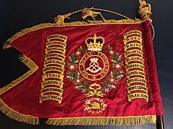 As a result of the Regiment's initial service during the Iraq war, in 2005 the Royal Yeomanry was awarded the battle honour "Iraq 2003".[43] This is the first such honour the regiment has won since its formation, and the first battle honour awarded to an Army Reserve regiment since the Second World War.[28] The honour is carried on the regiment's guidon. The guidon, presented to the regiment on 7 May 2016, additionally bears 40 of the battle honours won by its antecedent regiments. As well as these, the guidon also carries an artillery badge as a distinction, and four theatre honours awarded to those of its antecedents that were converted to artillery during the Second World War.[44]