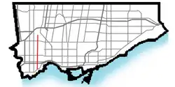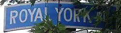 Royal York Road, historically known as Church Street or New Church Street, is a north-south arterial road in Toronto, Ontario, Canada. It is a concession road, 5 concessions (10 km) west of Yonge Street, and runs through many residential neighbourhoods, most notably Mimico and the Kingsway. It is classified as a "minor arterial" road by the city of Toronto.[1]