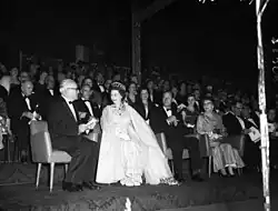 Planned as a less formal tour than the one in 1954, the Queen and Prince Philip returned in 1963, touring all the states and territories, with the primary purpose being to lead the Canberra jubilee celebrations commemorating the 50th anniversary of the naming of the capital.[23] The Queen's itinerary was prepared around the use of the royal yacht Britannia to convey her to each capital city in Australia. Having spent eight weeks travelling to every part of Australia in 1954, the decision to use Britannia as a permanent base meant she could entertain aboard ship and rest between each port as she travelled the 9,000 miles around Australia's coastline.[24]