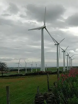 The Royd Moor Wind Farm is located at Penistone, Barnsley, South Yorkshire, England, and consists of thirteen 450 kW turbines. The site is located approximately 6 kilometres (3.7 mi) north west of Penistone, above the A628 trunk road between Barnsley and Manchester. The turbines are set in two parallel, staggered rows of six and seven,[1] on a ridge in hilly fell land lying 320 metres (1,050 ft) above sea level.