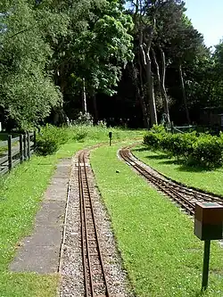 Wirral Model Engineers Society operate two miniature railways at the park. The society came into existence in 1961 and they have been developing the railway track and facilities ever since.[6] The first railway is a combined 2½, 3½ and 5½ inch gauge raised track for detailed scale models of full size steam locomotives; this track was extended in 1980 to 1,200 feet.[7] The second railway is a 7¼ inch gauge ridable miniature railway pulled by a traction locomotive; this track was extended to 2,267 feet in 2004.[7]