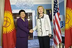 Otunbayeva was one of the key leaders of the Tulip Revolution in Kyrgyzstan which led to the overthrow of President Akayev.[12] Subsequently, she served for a few months as Acting Foreign Minister in the interim government of then prime minister (and acting president) Kurmanbek Bakiyev. After Bakiyev was elected President and Feliks Kulov became Prime Minister, Otunbayeva failed to receive the required parliamentary support to become Foreign Minister.[11]