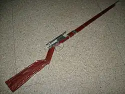 Rubber band guns can be made using only Popsicle sticks, staples, and rubber bands of various styles and sizes. This specialized technique developed and honed by then-high school student Stuart A. Burton[4] is very malleable and can be utilized to develop very advanced and complicated rubber band guns. For instance, using levers and sliding mechanisms, one can make a pump-action shotgun. Using simple geometry and specialized positioning, one can easily make semi-automatic and 2-shot burst-fire weapons, as well as more complicated fully automatic weapons using paperclips as an axis for a rotating firing piece. Occasionally, other materials (like bamboo skewers, for instance) may be used in the making of the gun.