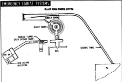The exit from the bunker was through a 366-meter (1,201 ft) long tunnel, in reality a large air duct, that opened to the outside at the perimeter of the pad. In the event that this route was blocked, there was an emergency escape hatch in the roof of the dome.[2]